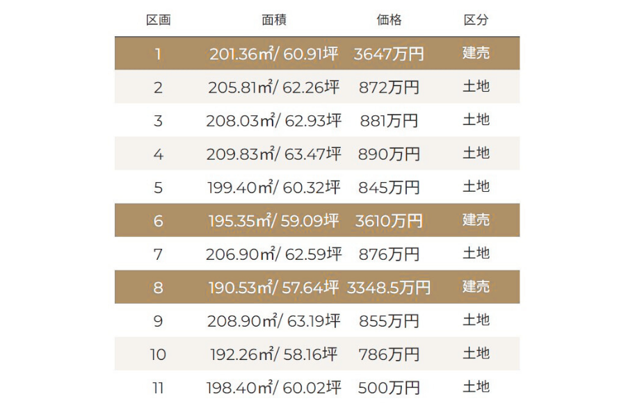 | 価格 | 土地のみ区画:500万円~890万円 / 建売区画:3348.5万円~3647万円 |